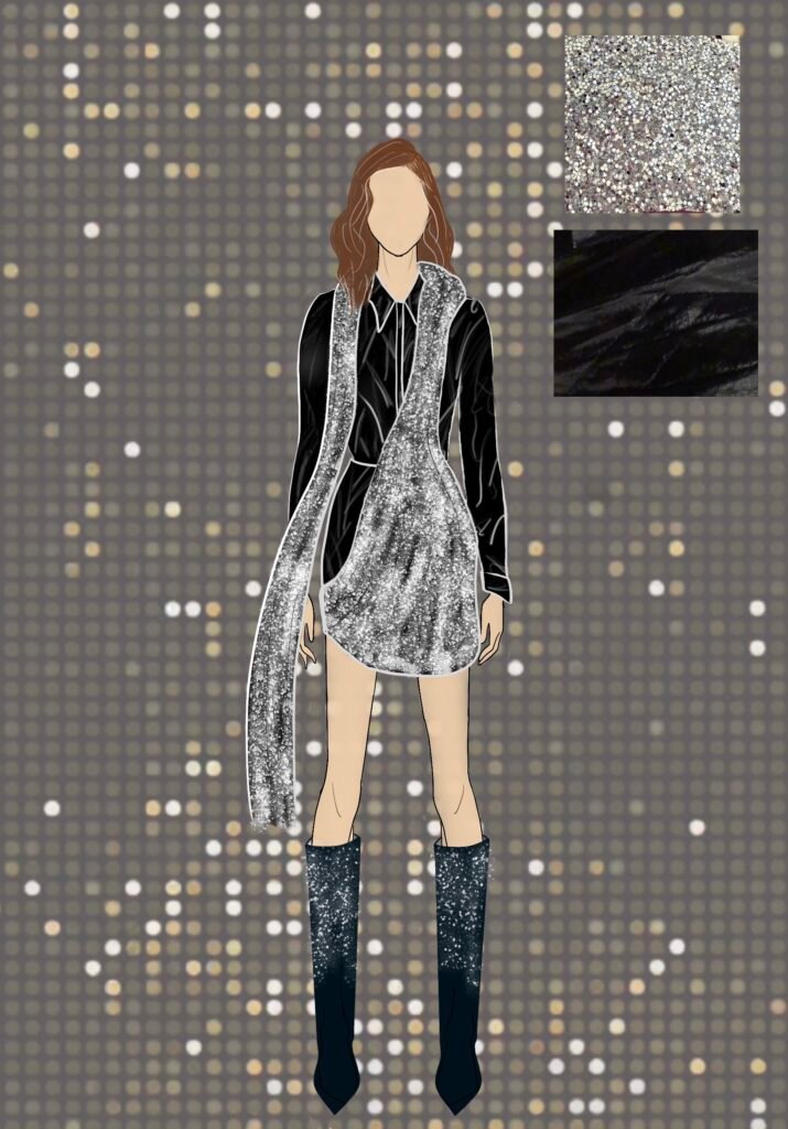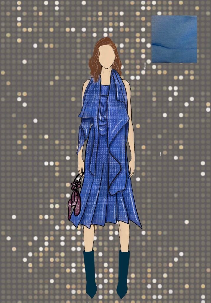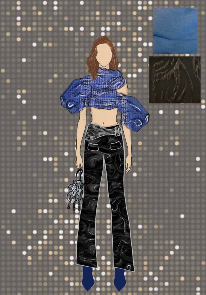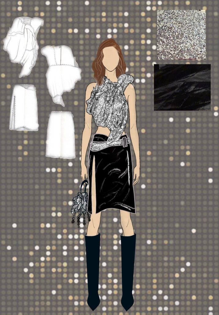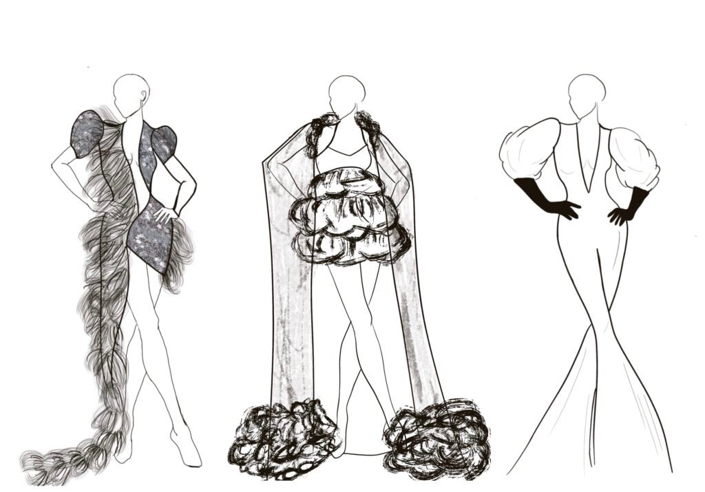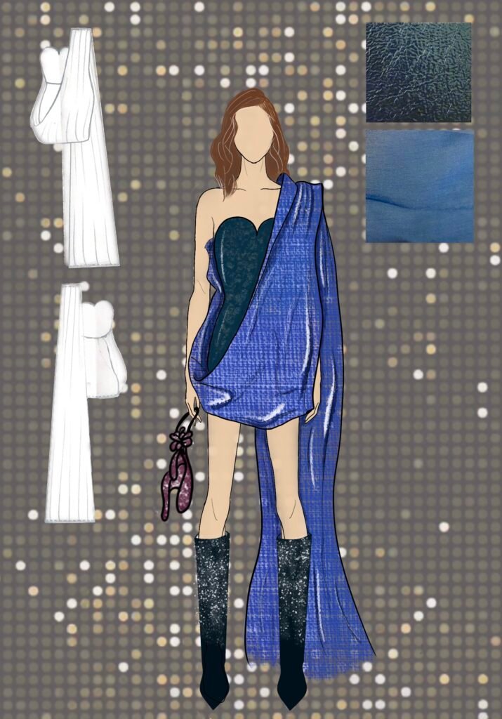 Dancing Queen for me isn’t just a song; it’s a feeling rooted deeply inside my heart. It’s a song that creates memories and experiences every time you hear it again. Being a song very personally close to me, as my friends and I listen to it in all our happy and sad moments while shouting it at the top of our lungs and crying to it at the same time. It is also a song that represents femininity, which is more about being carefree, joyful, and bold and is the true essence of the 1970s disco era. The song and 70s disco are all about the feeling of shimmers, glamour, bold colors, and movement, and that is what my designs for this collection would represent.