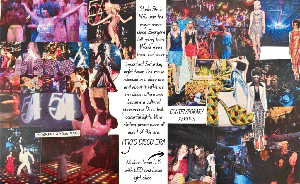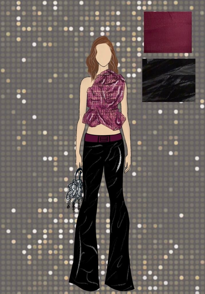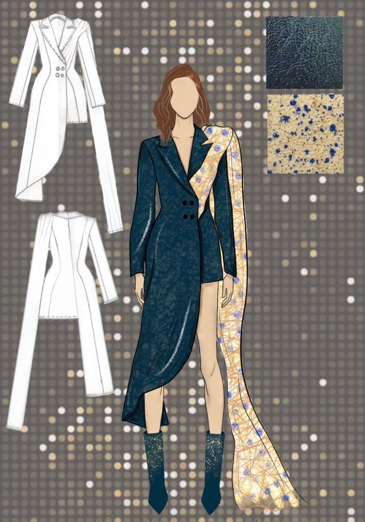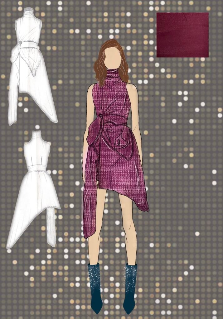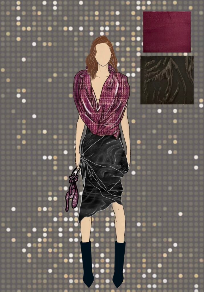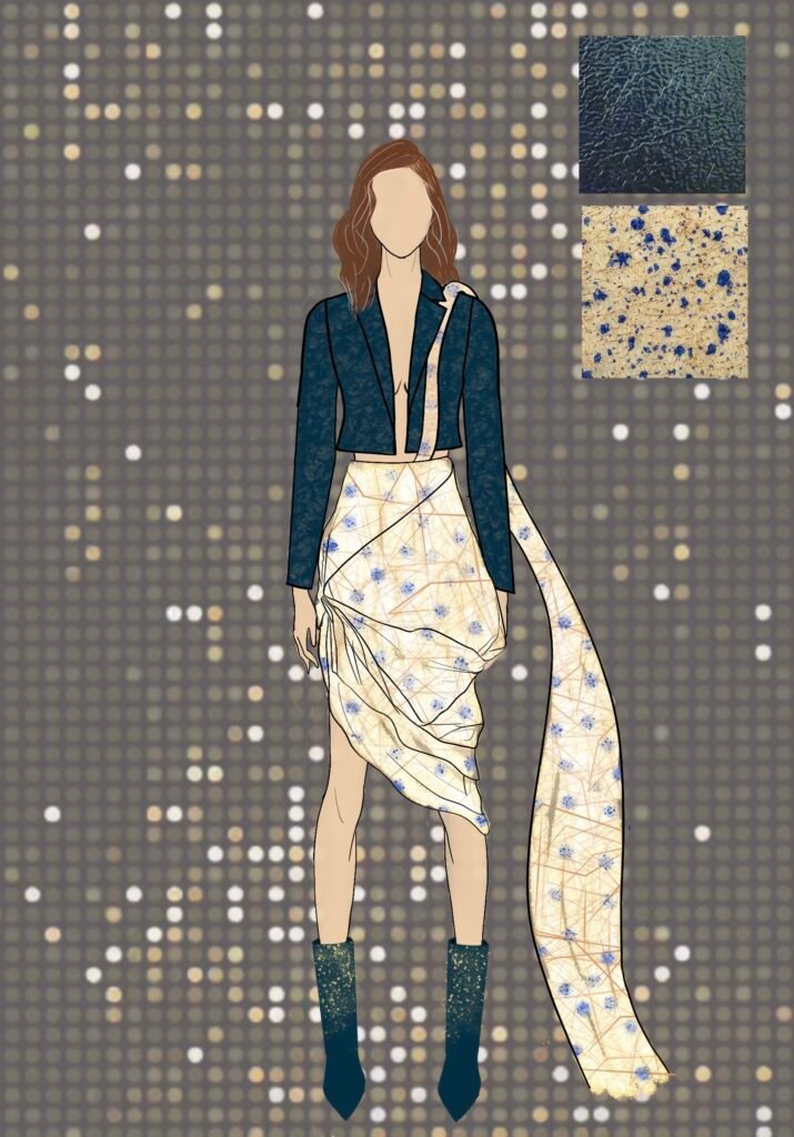 Dancing Queen for me isn’t just a song; it’s a feeling rooted deeply inside my heart. It’s a song that creates memories and experiences every time you hear it again. Being a song very personally close to me, as my friends and I listen to it in all our happy and sad moments while shouting it at the top of our lungs and crying to it at the same time. It is also a song that represents femininity, which is more about being carefree, joyful, and bold and is the true essence of the 1970s disco era. The song and 70s disco are all about the feeling of shimmers, glamour, bold colors, and movement, and that is what my designs for this collection would represent.